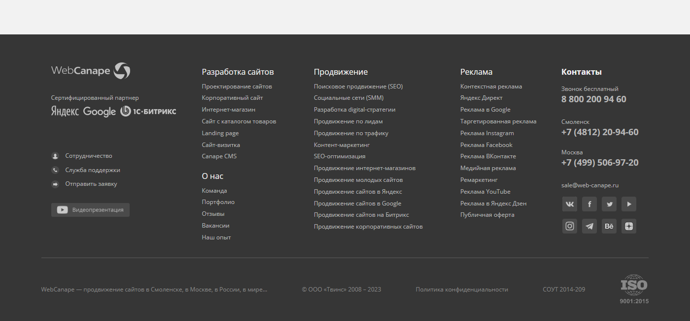 - Ссылки на социальные сети, такие как Вконтакте, Facebook, Twitter, Instagram, канал Youtube и другие.