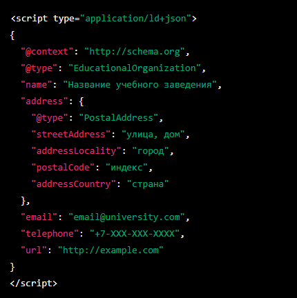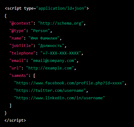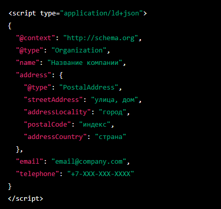 Ниже приведены примеры микроразметки контактов на сайте с использованием формата JSON-LD: