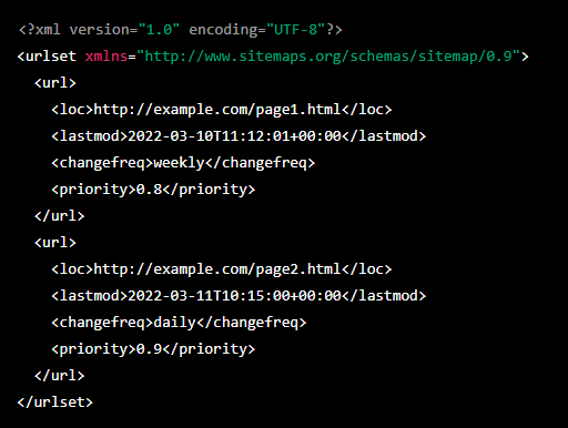 Этот пример содержит два элемента <url>, каждый из которых содержит информацию о странице сайта, включая: